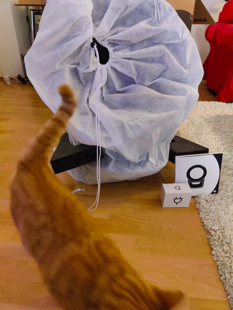 À l’intérieur, tout est emballé avec soin : mousse, protections, notice illustrée… On sent que Whisker a voulu rendre l’expérience « prêt-à-utiliser ». Les guides sont clairs, les étapes simplissimes. En 10 minutes chrono, la sphère futuriste trônait dans le salon, prête à conquérir mon matou.