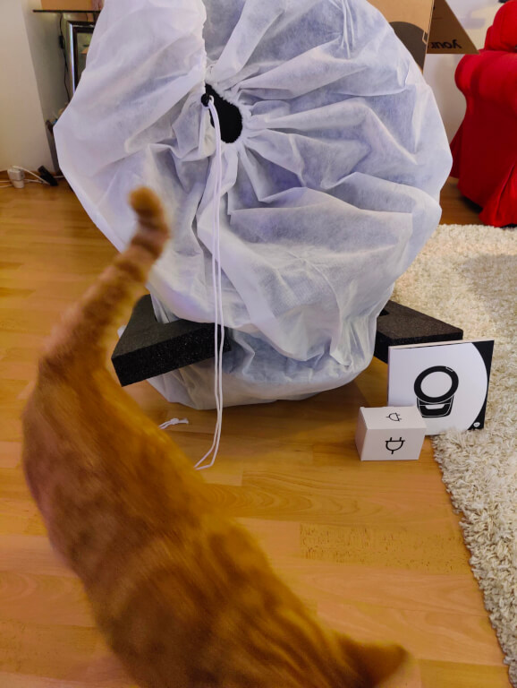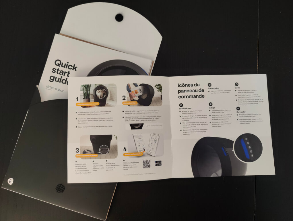À l’intérieur, tout est emballé avec soin : mousse, protections, notice illustrée… On sent que Whisker a voulu rendre l’expérience « prêt-à-utiliser ». Les guides sont clairs, les étapes simplissimes. En 10 minutes chrono, la sphère futuriste trônait dans le salon, prête à conquérir mon matou.