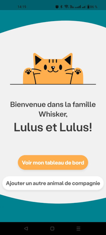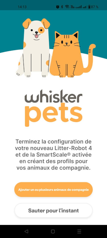 Après installation, direction le smartphone pour connecter la litière via l’appli Whisker. Si certains termes techniques restent en anglais (petit bémol pour les francophones pur jus), l’interface est intuitive. On y trouve :