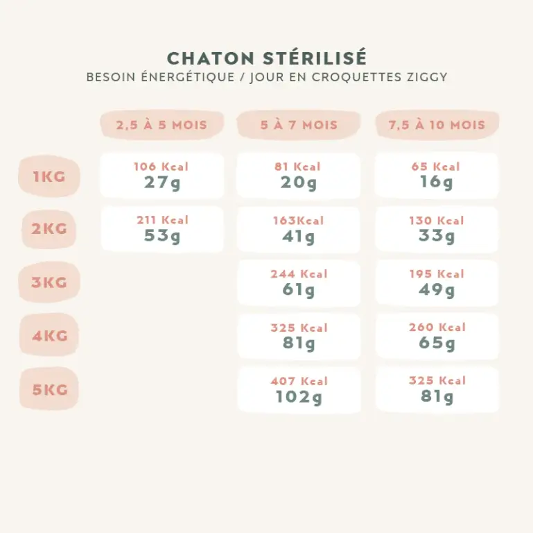 Pour vous aidez à vous y retrouver, voici un tableau récapitulatif des besoins énergétiques du chaton selon son âge :